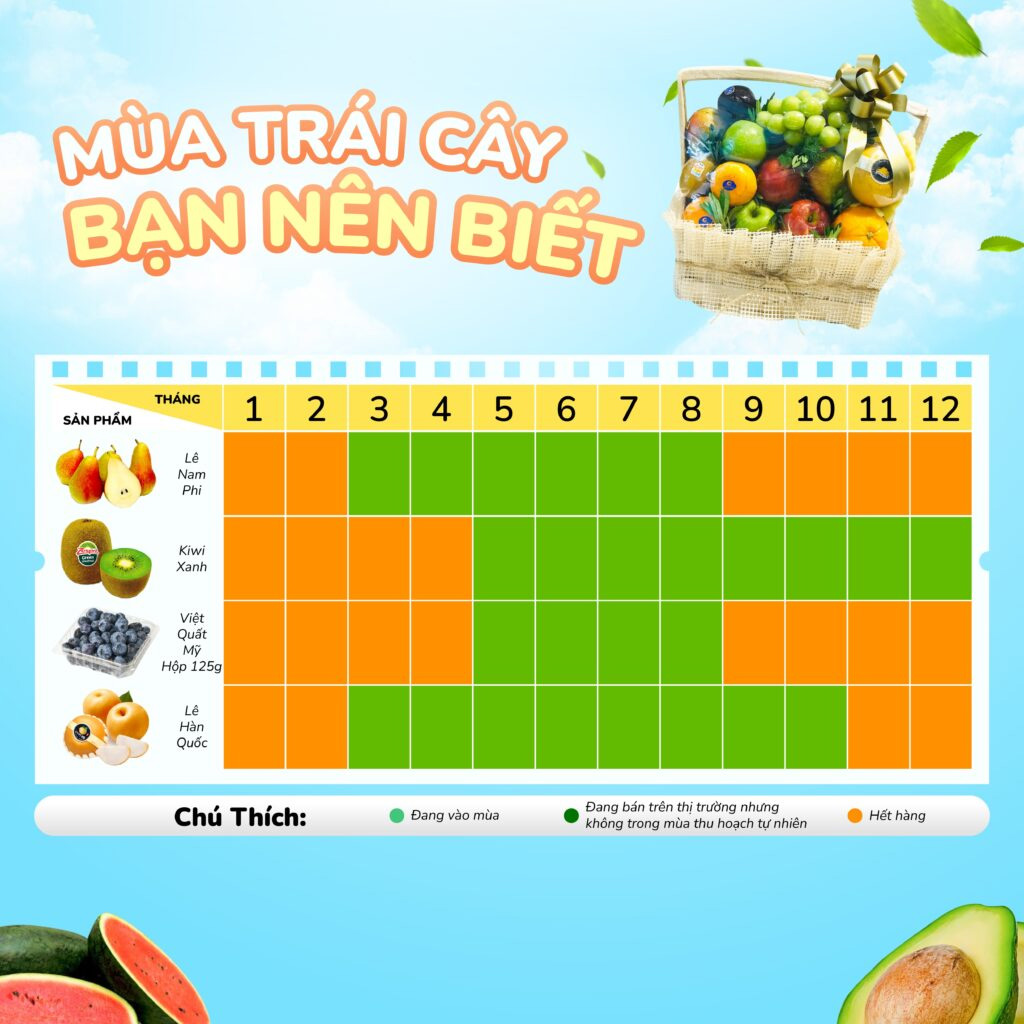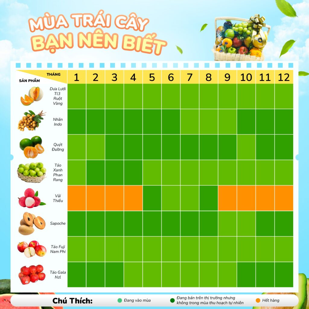 Đây là khoảng thời gian mùa xuân và bạn có thể dễ dàng tìm thấy các loại trái cây phổ biến như: chuối, bưởi, Sa pô chê, thơm, đu đủ, nhãn, xoài, nho, ổi, mận, dưa hấu, quýt, dừa, mãng cầu gai, cam…