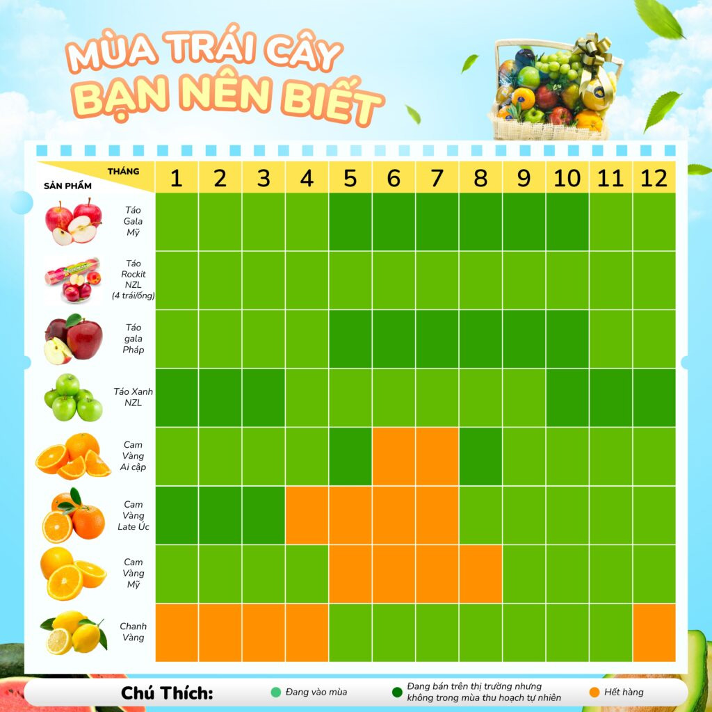 Ngày nay, nhờ vào công nghệ nông nghiệp phát triển mà có vô số các loại trái cây được tìm thấy quanh năm như dưới đây: